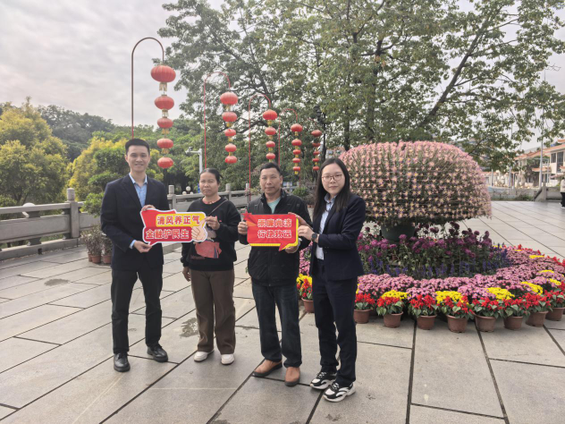 本次活動以“文化搭臺、金融唱戲、廉潔鑄魂”為思路,創(chuàng)新打造“三維宣傳矩陣”,讓廉潔金融知識以更鮮活、更接地氣的形式觸達公眾。在宣傳陣地建設(shè)上,小欖支行黨員們志愿者以小欖鎮(zhèn)菊花文化展區(qū)為宣傳陣地,向來往游客派發(fā)傳單,向他們介紹銀行廉潔從業(yè)規(guī)定、金融反腐案例以及消費者權(quán)益保護等內(nèi)容,同時普及防范 “人情貸”“關(guān)系貸”、警惕金融掮客、拒絕違規(guī)返利等實用技巧,引導(dǎo)公眾成為廉潔金融的監(jiān)督者與宣傳員,共建清朗金融生態(tài)?;顒又刑貏e設(shè)置廉潔合影活動,讓游客手持“清風(fēng)養(yǎng)正氣、金融護民生”、“崇廉尚潔、行穩(wěn)致遠(yuǎn)”字樣kt板在菊花前合影,將“出淤泥而不染”的菊花品格與清廉金融的初心相呼應(yīng),展現(xiàn)“堅守廉潔底線、共建清朗金融生態(tài)”的共識。