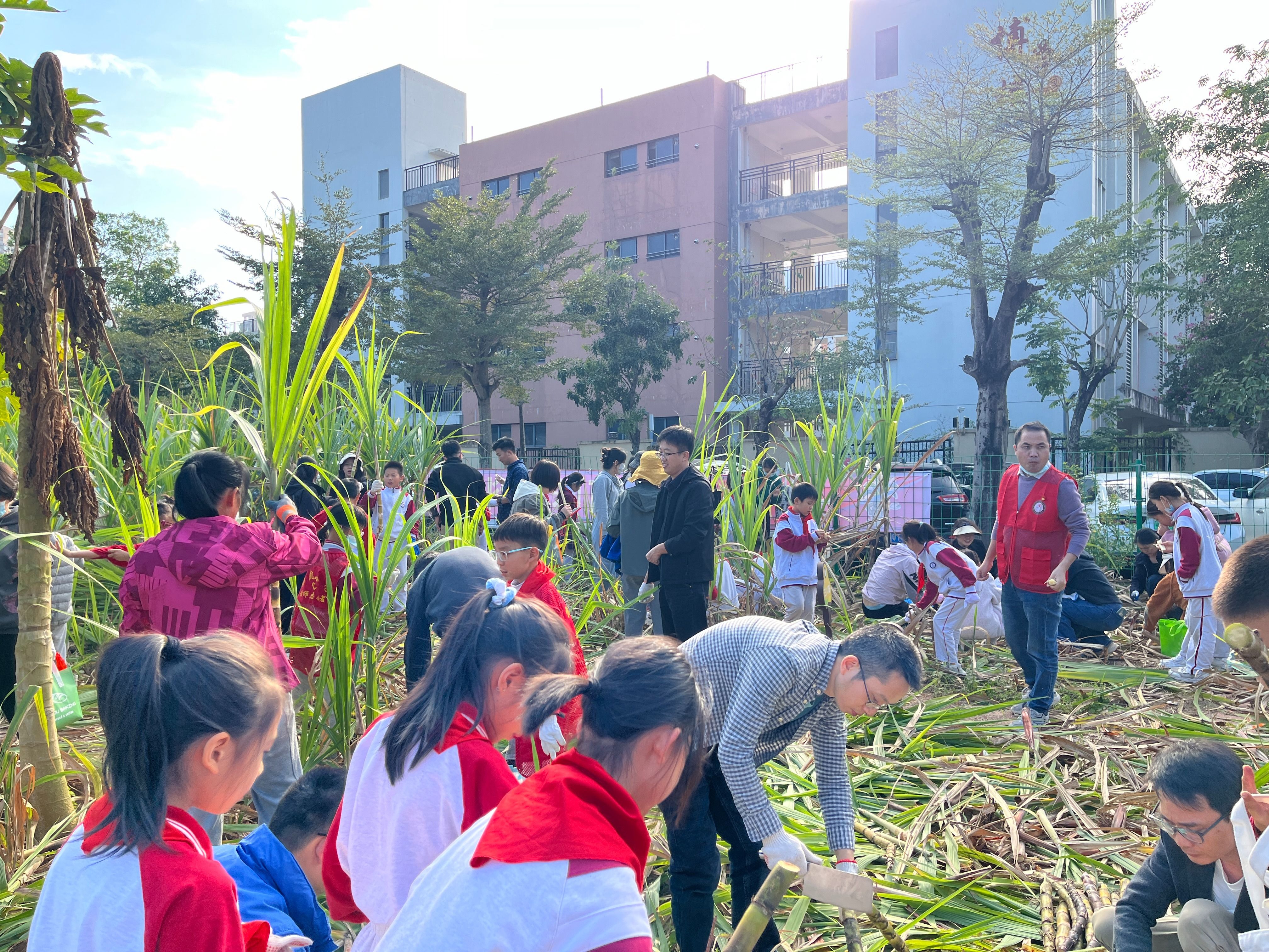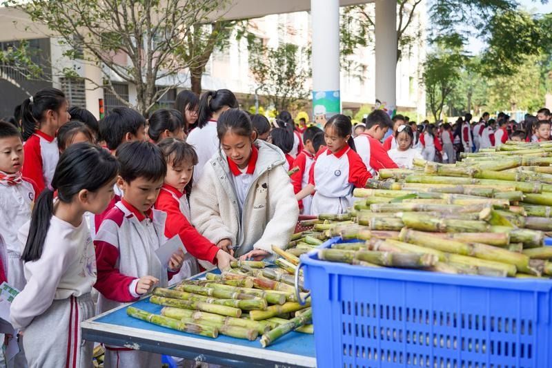 同學(xué)們手里甜滋滋的甘蔗,是今年3月植樹節(jié)和老師一起在學(xué)校勞動(dòng)基地種下的?!斑@都是同學(xué)們自己勞動(dòng)的成果?!笨粗蠹彝娴帽M興,站在兌獎(jiǎng)區(qū),為學(xué)生派發(fā)甘蔗的副校長(zhǎng)謝少聲露出了欣慰的笑容。她說,今年年初有家長(zhǎng)捐贈(zèng)甘蔗苗,學(xué)校便在植樹節(jié)統(tǒng)一播種,邀請(qǐng)勞動(dòng)專家指導(dǎo)種植。各班同學(xué)長(zhǎng)期跟蹤記錄甘蔗施肥、澆水、除草的生長(zhǎng)過程。經(jīng)過9個(gè)月的精心養(yǎng)護(hù),12月15日甘蔗迎來豐收,學(xué)校特意邀請(qǐng)家長(zhǎng)代表和同學(xué)們一起收割。當(dāng)天的主題活動(dòng),就是為了讓同學(xué)們在參與中更深了解甘蔗文化。