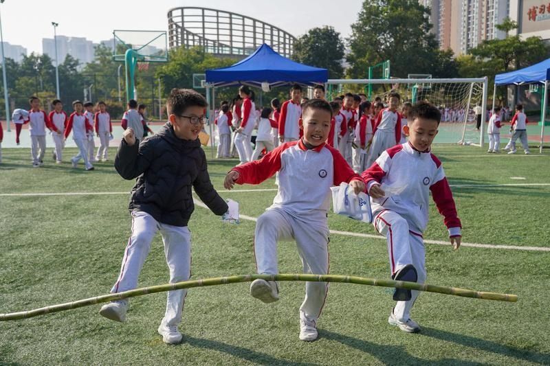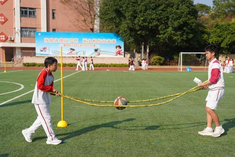 下午2點(diǎn),火炬開發(fā)區(qū)博凱小學(xué)的操場(chǎng)早已被歡聲笑語填滿。兩名同學(xué)面對(duì)面站定,雙手各握一根甘蔗,小心翼翼地夾住小球,一步一步向終點(diǎn)挪去。成功沖線時(shí),小球居然穩(wěn)穩(wěn)沒掉!兩人立刻開心地?fù)肀g呼,蹦蹦跳跳停不下來。