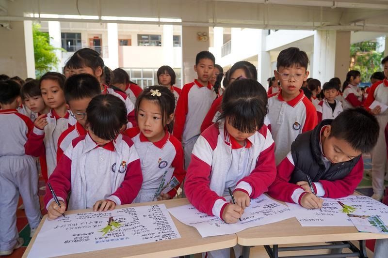 當(dāng)天的甘蔗游戲可不止體育類,校園里50多個(gè)游戲攤位前都排起了長(zhǎng)隊(duì)。語文學(xué)科藏著語言樂趣:看圖說話攤位上,同學(xué)們盯著甘蔗主題圖畫滔滔不絕講起小故事;“用筆寫蔗”游戲中,同學(xué)們稚嫩的小手握著毛筆,寫出各式風(fēng)格的“蔗”字。數(shù)學(xué)攤位上,同學(xué)從一堆甘蔗里細(xì)心挑選,掂量出1千克的重量,或是蹲在地上用尺子、繩子測(cè)量甘蔗長(zhǎng)度。美術(shù)組里,同學(xué)們仔細(xì)觀察甘蔗后,在空白書簽上一筆一劃畫起甘蔗,形成了一個(gè)個(gè)精美的書簽。