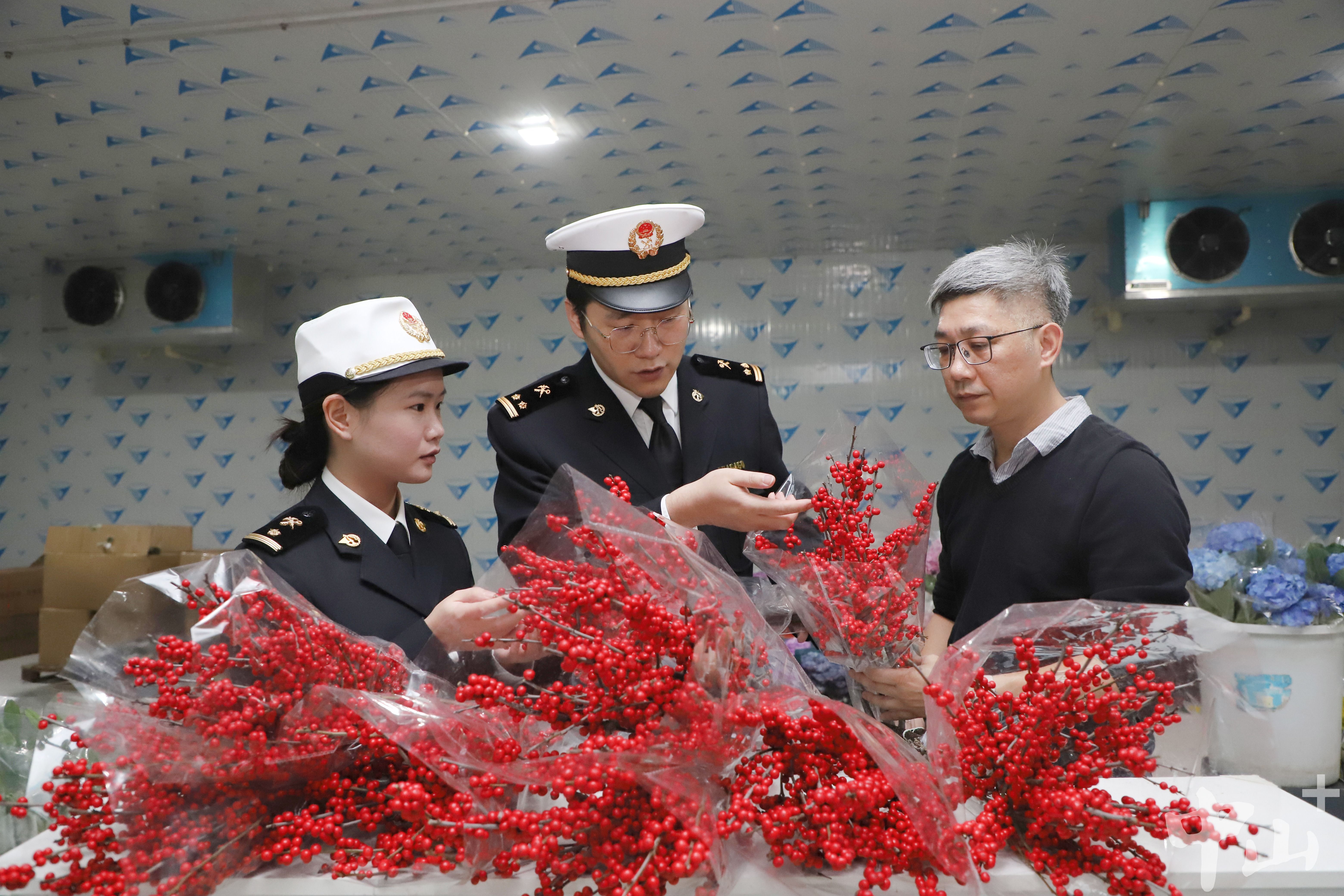 中山海關(guān)關(guān)員在對(duì)供澳鮮切花開展屬地查檢。黃妙雙 攝