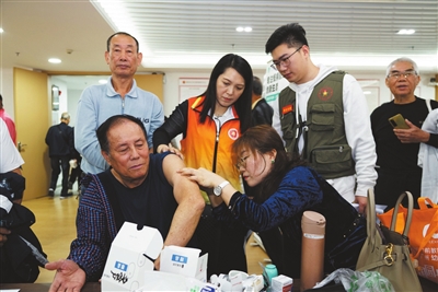 工作人員、志愿者協(xié)助退役軍人測血糖。本報(bào)記者 黃藝杰 攝