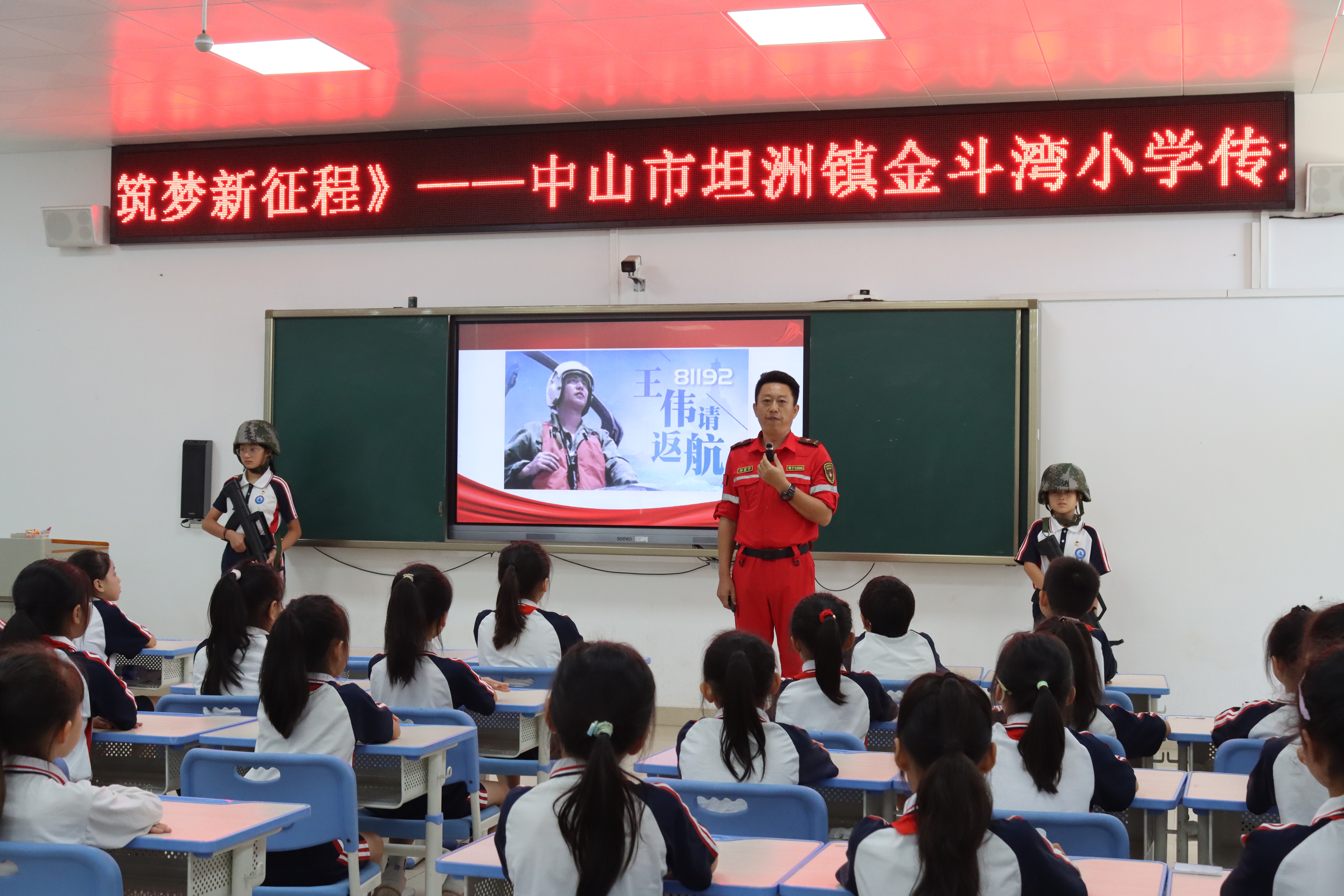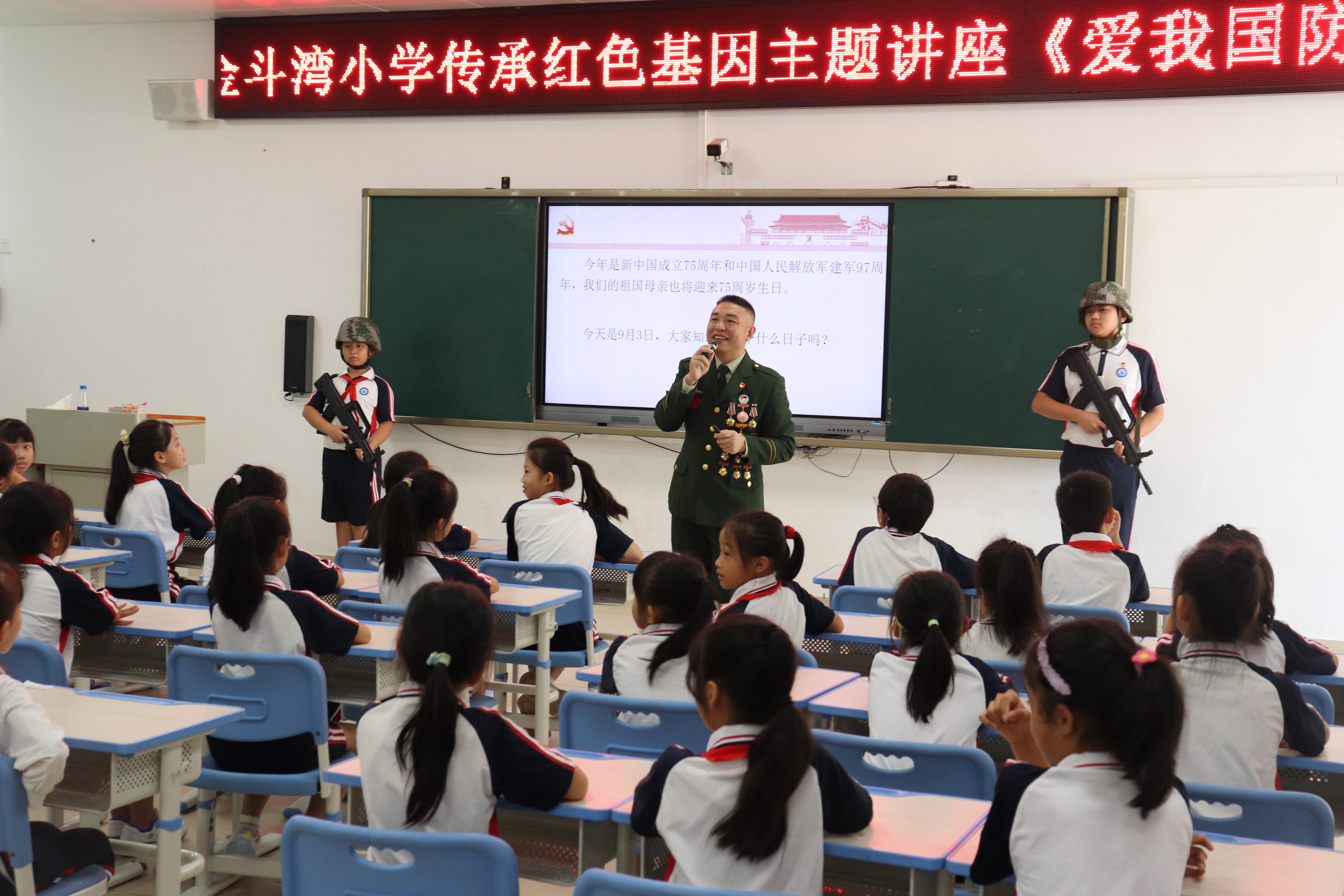 在坦洲鎮(zhèn)金斗灣小學,坦洲鎮(zhèn)“老兵宣講團”成員梁華與學生們展開互動,通過提問的方式引導學生銘記歷史、傳承紅色基因。
