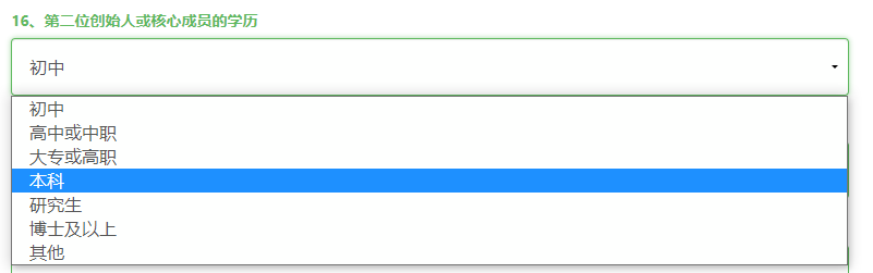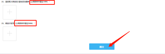 學(xué)歷一欄系統(tǒng)默認(rèn)為“初中”,如需修改,點擊可跳出其他內(nèi)容選項,按實際情況選擇即可。注意根據(jù)內(nèi)容提示填寫相應(yīng)正確信息,有“*”標(biāo)志的為必填內(nèi)容,注意退役軍人轉(zhuǎn)業(yè)證/退伍證掃描件上傳附件不得超過10M,商業(yè)計劃書上傳附件不得超過30M。報名表所有項目內(nèi)容格式須完全填寫正確才可成功上傳。如圖11-12所示: