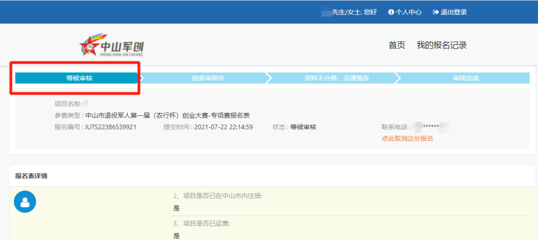 參賽用戶完成注冊后,點擊【提交】按鈕,即可報名成功,提交狀態(tài)顯示為“等待審核”。如圖13-14所示: