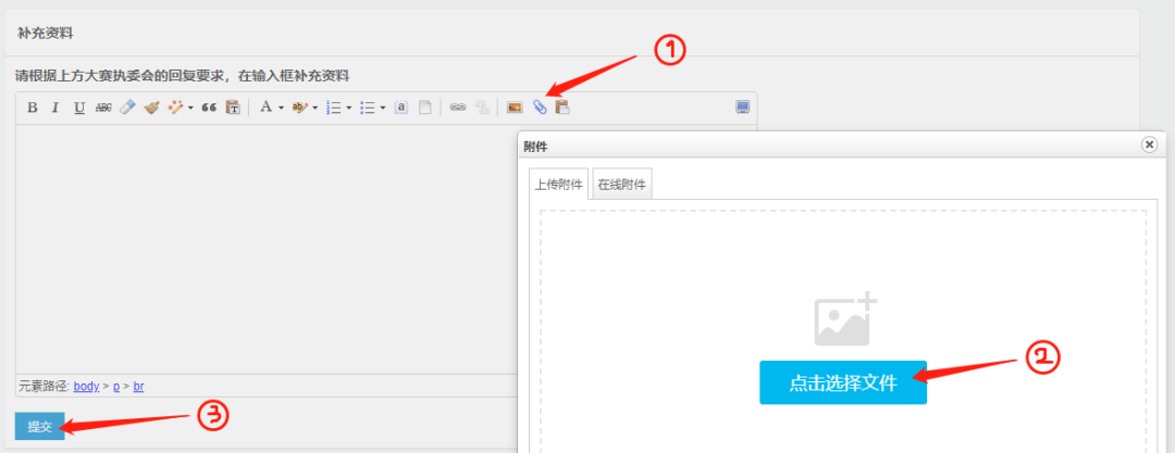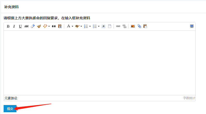若想對已提交的報名信息進(jìn)行補(bǔ)充,可在登陸首頁點擊“我的報名記錄”,點擊【查看詳情】進(jìn)入報名表詳情頁面,拉至頁面底部的補(bǔ)充資料欄,點擊回形針圖標(biāo)添加補(bǔ)充文件,再點擊提交即可。如圖15-16所示: