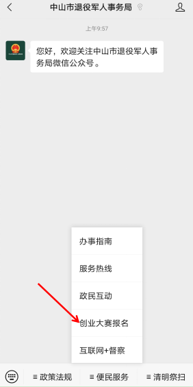 微信搜索“中山市退役軍人事務(wù)局”或者掃描下方二維碼,即可關(guān)注公眾號。進(jìn)入“中山市退役軍人事務(wù)局”官方微信公眾號,在下方功能欄找到“便民服務(wù)”,點擊選擇“創(chuàng)業(yè)大賽報名”即可進(jìn)入報名系統(tǒng)。如圖17-19所示: