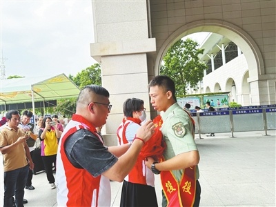 中午12點(diǎn)左右,3位退役軍人走出中山站出站口,迎接他們的不僅有鮮艷的綢緞大紅花,熱烈的歡迎儀式,還有等待已久的網(wǎng)約車(chē)愛(ài)心車(chē)隊(duì)。網(wǎng)約車(chē)愛(ài)心車(chē)隊(duì)駕駛員伏子陽(yáng)為其中一名退役軍人戴上大紅花,并把他安全護(hù)送回到位于港口的家。“我以前也是一名退役軍人,今天看見(jiàn)他們,就像看見(jiàn)了當(dāng)年的自己一樣。很高興能為他們提供愛(ài)心接送服務(wù)?!狈雨?yáng)表示,他加入網(wǎng)約車(chē)愛(ài)心車(chē)隊(duì)曾參加過(guò)愛(ài)心送考、防疫服務(wù)等活動(dòng),這次是首次執(zhí)行愛(ài)心接送退役軍人任務(wù)。