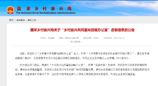 記者還了解到,2022年4月份國家鄉(xiāng)村振興局就在官網(wǎng)上發(fā)布相關(guān)辟謠聲明,并提醒社會各界群眾應(yīng)提高警惕注意防范,發(fā)現(xiàn)類似活動及時向有關(guān)部門舉報或報警處置。