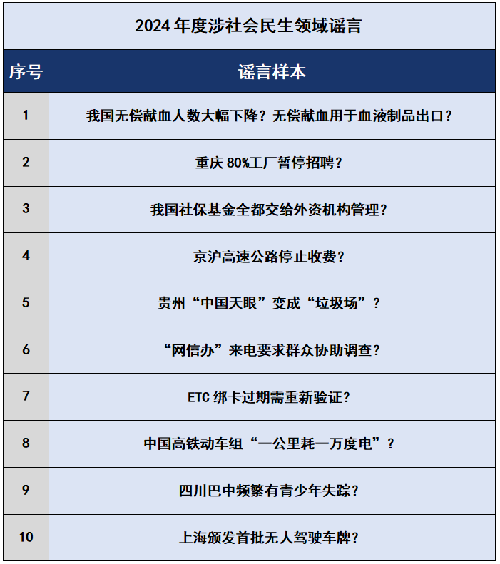 2024年2月,個別自媒體發(fā)出“無償獻血人數(shù)大幅下降,無償獻血用于血液制品出口”的不實言論,利用全社會對公益事業(yè)的關(guān)注和信息不對稱誤導公眾,故意抹黑我無償獻血政策,影響血液采集正常秩序,引發(fā)公眾對無償獻血的誤解。一些別有用心之人惡意編造謠言“我國社?;鹑冀唤o外資機構(gòu)管理”,抓住社?;鸸芾碇械牟糠终:献鬟M行夸大和錯誤解讀,以偏概全、歪曲事實,引發(fā)公眾對社保體系的擔憂和恐慌。還有一些自媒體夸大其詞、虛構(gòu)數(shù)據(jù),捏造謠言“重慶80%工廠暫停招聘”,干擾勞動力市場正常秩序,影響地區(qū)經(jīng)濟發(fā)展。所謂“‘網(wǎng)信辦’來電要求群眾協(xié)助調(diào)查”則實為詐騙分子冒充權(quán)威機構(gòu)行騙,嚴重損害政府部門的公信力。