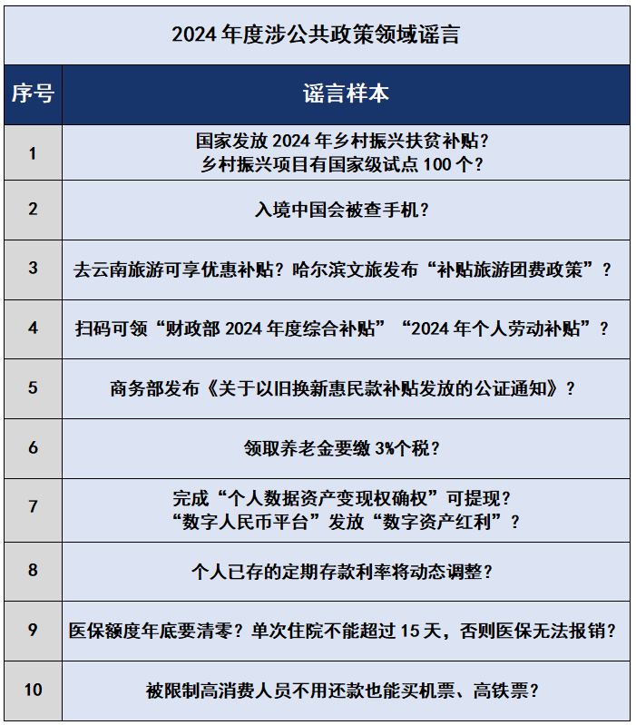 2024年3月,有不法分子冒用國家機關(guān)名義,假稱“國家發(fā)放2024年鄉(xiāng)村振興扶貧補貼”“鄉(xiāng)村振興項目有國家級試點100個”,以高額返利為誘餌,引誘大量不明真相的群眾加入所謂的各類“基金會”和“項目”,巧立名目騙取錢財。還有自媒體從公開發(fā)布的政策信息中摘取碎片化信息,斷章取義,對政策歪曲解讀。如2024年10月,個別自媒體故意混淆“個人養(yǎng)老金”與“基本養(yǎng)老金”的概念,傳播“領(lǐng)取養(yǎng)老金要繳3%個稅”“養(yǎng)老金個稅起征點為5000元”等不實信息,引發(fā)公眾誤解。此外,在《國家安全機關(guān)行政執(zhí)法程序規(guī)定》和《國家安全機關(guān)辦理刑事案件程序規(guī)定》公布之際,一些別有用心之人借機造謠抹黑、搬弄是非,大肆炮制所謂“入境中國都會被查手機”的謠言,荒謬至極。
