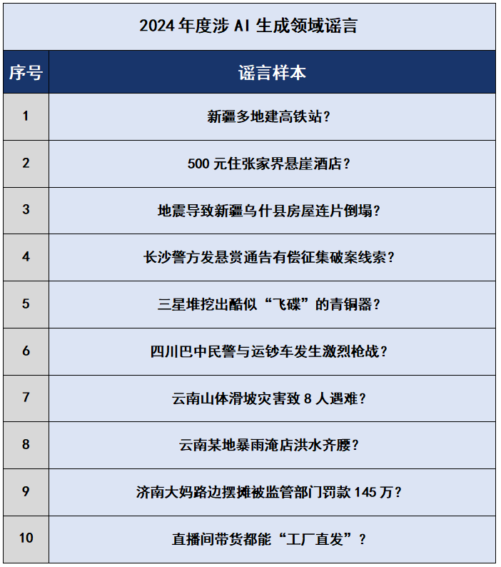 2024年初,“新疆多地建高鐵站”虛假短視頻在網(wǎng)上流傳,此類視頻由軟件智能合成,用戶只需使用指定視頻模板、手動替換涉本人家鄉(xiāng)相關(guān)地點的文字即可生成新視頻,利用人們對家鄉(xiāng)基礎(chǔ)設(shè)施建設(shè)情況的關(guān)注而大肆傳播,誤導公眾。還有個別網(wǎng)民為獲取流量和不當利益,利用AI軟件蓄意歪曲“交警請占道停留的運鈔車駛離”的事實,編造謠言“四川巴中民警與運鈔車發(fā)生激烈槍戰(zhàn)”,造成公眾恐慌和誤解。此外,謠言“濟南大媽路邊擺攤被監(jiān)管部門罰款145萬”實為AI工具生成的虛假文章,大肆消費公眾的同情心博取眼球,引發(fā)大范圍傳播,造成不良社會影響,相關(guān)違法人員被公安機關(guān)依法行政拘留?!霸颇仙襟w滑坡災(zāi)害致8人遇難”“地震導致新疆烏什縣房屋連片倒塌”“云南某地暴雨淹店洪水齊腰”等謠言則純屬子虛烏有,均為AI特效炮制的虛假視頻,利用公眾對災(zāi)難事件的重視編造傷亡情況,制造恐慌情緒,擾亂社會秩序。