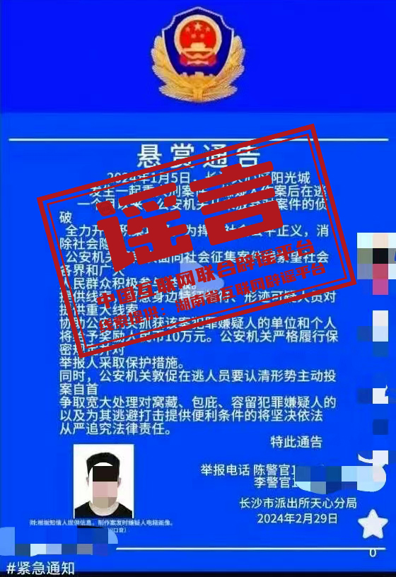 謠 言 湖南省長(zhǎng)沙市天心區(qū)發(fā)生重大刑案,警方發(fā)布懸賞通告?