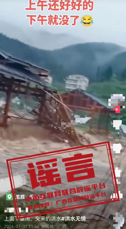 詳情:近日,有網(wǎng)民發(fā)布視頻稱“桂林龍勝一風(fēng)雨橋被洪水沖毀”,并配文“上午還好好的,下午就沒(méi)了”,引發(fā)關(guān)注。經(jīng)當(dāng)?shù)毓膊块T核實(shí),偉江鄉(xiāng)轄區(qū)內(nèi)風(fēng)雨橋完好無(wú)損,不存在倒塌的情況。該視頻系當(dāng)?shù)鼐W(wǎng)民龍某某罔顧事實(shí)、故意編造,將網(wǎng)上看到的其他地方的風(fēng)雨橋被毀視頻重新編輯并定位在偉江鄉(xiāng)進(jìn)行發(fā)布。目前,警方已依法對(duì)龍某某予以行政處罰。(來(lái)源:廣西互聯(lián)網(wǎng)辟謠平臺(tái)、龍勝公安)