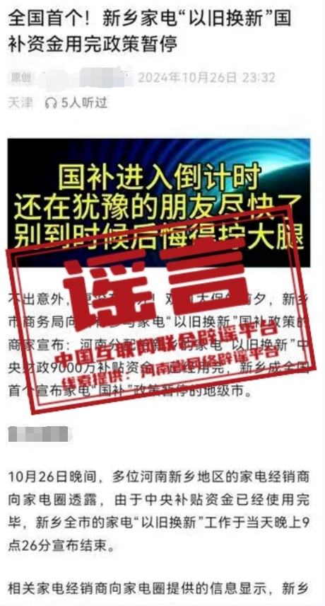 謠 言  河南新鄉(xiāng)家電“以舊換新”國(guó)家補(bǔ)貼資金用完、政策暫停?